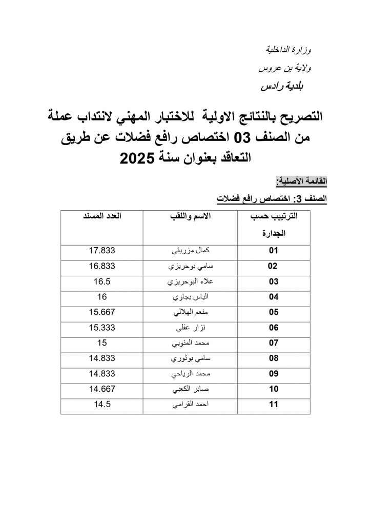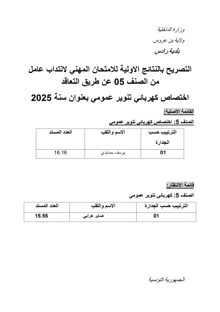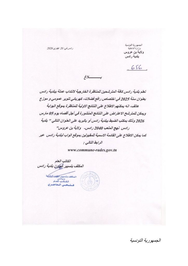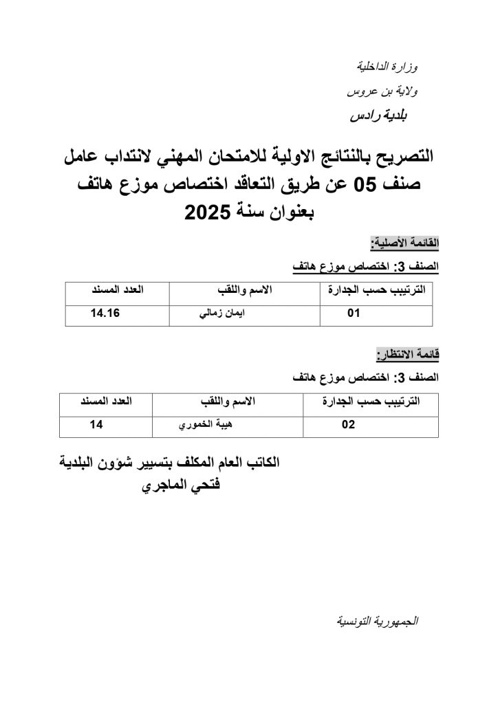 بلاغ حول النتائج الأولية للمناظرة الخارجية لانتداب عملة ببلدية رادس بعنوان سنة 2025 في اختصاصات موزع هاتف، كهربائي تنوير عمومي و رافع فضلات